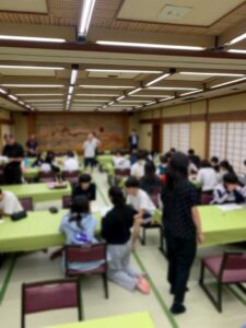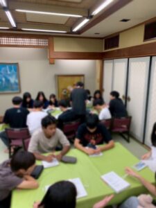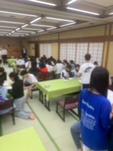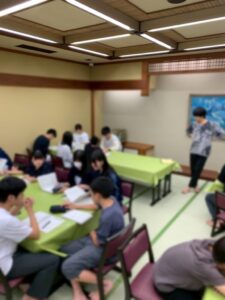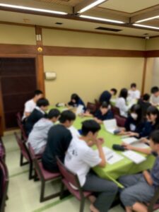 今日の振り返りをしています。何を学んだのか、改善した方がいいことはあるのか、よりよい集団宿泊学習になるようにみんなで話し合っています。