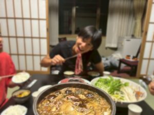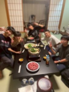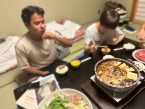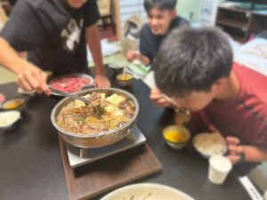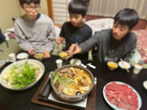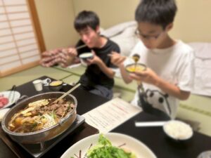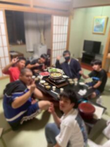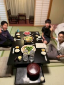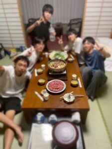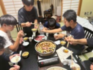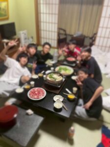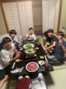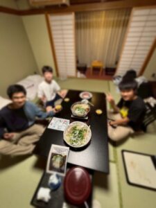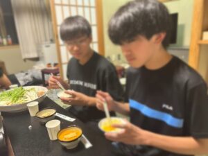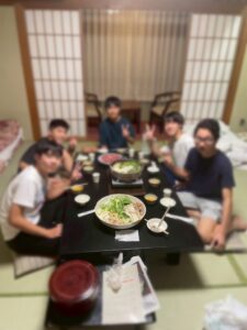 今日はそれぞれの部屋で食事です。今回は男子部屋の素晴らしい食べっぷりをご覧ください。