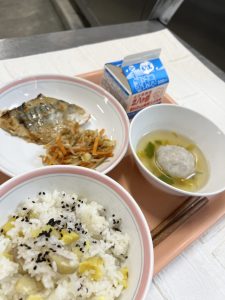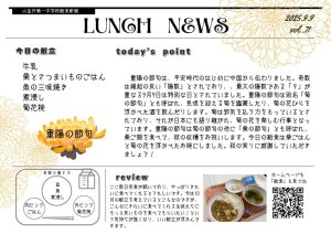 重陽の節句は別名「菊の節句」とも呼ばれ、見頃を迎える菊を鑑賞したり、菊の花びらを浮かべた酒を飲んだりします。菊は邪気を払う力をもっているとされており、それが日本にも語り継がれ、菊の花を楽しむ行事となっています。重陽の節句は菊の節句の他に「栗の節句」とも呼ばれ、栗ご飯を食べて、秋の収穫をお祝いします。今日の給食は栗ごはんと菊の花を浮かべたお椀にしました。