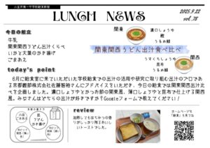 「今日出汁くらべだよね!」と楽しみにしている生徒もいました!配膳の時間も何だかみんなそわそわ?汁を受け取りながら「どっちが関東だっけ?」と何回聞かれたことか…。いただきますのあとは、それぞれを味わい「関西うまい」「私は関東」「関東と関西を混ぜたら日本だね」「は◯まるうどん越えた」などと言いながら食を楽しんでいました。そしてChromebookでアンケートをとりました。回答締切前なのですが、現時点では「関西191人」「関東98人」と言う結果がでています。好きだと思った理由についても色々と書いてくれていたので集計が終わり次第、ホームページと給食だよりで紹介したいと思います。