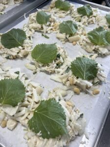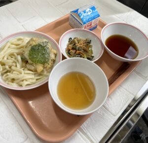 おかずはかき揚げにしました。大葉は刻まず1枚のせたい!と思ったのですが、うまく衣がついておらず揚げると見事に剥がれてしまいました。次からはしっかりと衣で接着してなんとかリカバリーできました!調理員さんは大変だったけれど仕上がりがきれいなのでやってみてよかったなと思っています。