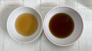 6月に給食室に来ていただいた学校給食での出汁の活用や研究に取り組む出汁のプロである京都鰹節株式会社佐藤智裕さんにアドバイスをいただき、今日の給食では関東関西出汁比べを企画しました。濃口しょうゆとかつお節の関東風、薄口しょうゆと昆布で仕上げる関西風。