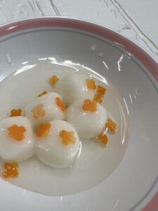 日本だからこそ四季折々の花を楽しむことができます。また、その花に見立てた料理も楽しむことができます。今月の季節のお花献立は「きんもくせい」です。今年は猛暑のため開花が遅れているようですが、毎年この時期、どこからかふわっとした優しい香りに気がつき、秋が訪れたな~と感じます。忙しい毎日ですが、咲く花を見て、香りを感じ、季節の移ろいに気がつき、ゆったりとした時間を少しでも、もつことができたらいいなと思います。
