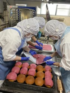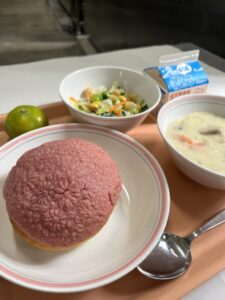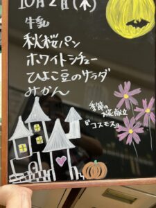 季節のお花を表現する献立は昨年度から実施しています。りんごでバラ、紫色で藤、あじさいなどを表現しました。夏はひまわりパン、先週は金木犀でした。