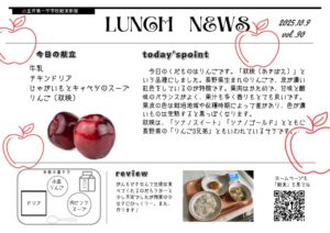 今日のくだものはりんごです。「秋映(あきばえ)」という品種にしました。長野県生まれのりんごで、皮が濃い紅色をしているのが特徴です。果肉はかためで、甘味と酸味のバランスがよく、果汁も多く香りもとても良いです。果皮の色は栽培地域や収穫時期によって差があり、色が濃いものは完熟すると黒っぽくなります。