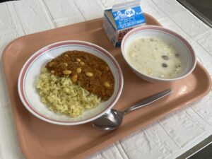 豆が苦手な人が多いようで、片付けをしているときれいに豆だけを食缶に残している人がいます。味が染みにくいし、ちょっとぽそぽそしていて食べにくところもありのもわかります。今日は苦手に人でも食べやすいようにチリ味にしました。細かく刻んだら食べやすいけれど、今日はあえて丸のままにしました。苦手なものでも味付けや調理法によっては食べられるということを給食で知ってほしいからです。苦手なものにもチャレンジしましょう!