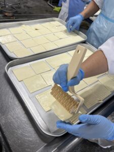専用のローラーでパイ生地に切れ目を入れます。なかなかコツのいる作業でした…