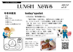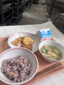 給食は色々な人の働きがあって、みなさんのところに届いています。今日は「あわ」「きび」「豆」の入ったご飯にしました。勤労、収穫に感謝し、穀物を一粒も無駄にしないという気持ちをもって食べましょう!