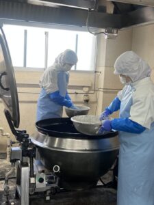 教室では配るスペースが限られているので、ひとつにバットにいかとさつまいもを入れます。