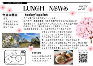 江戸時代、農業指導者 川崎平右衛門の手で玉川上水沿いに桜が植えられ、小金井の人々に大切にされてきた小金井桜が、昨年の12月9日に国の文化財として指定されてから100周年を迎えました。小金井だからこそ見ることができるこの桜をいつまでも大切にしてほしいという気持ちを込めて市内小中学校では12月と4月に桜献立を実施しています。
