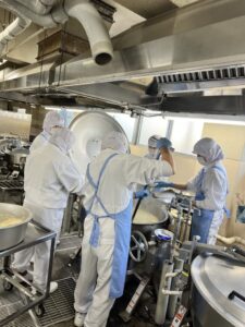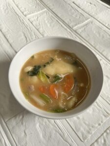 東京都産のみそとしょうゆで味を付け、江戸東京野菜とすいとんを取り入れたオリジナル汁物「江戸こがね汁」です。召し上がれ!
