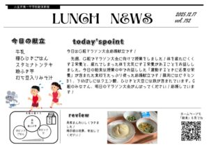 先週、G組でマラソン大会に向けて授業をしました!体を疲れにくくする栄養と、疲れてしまった体を元気にする栄養があることをお話ししました。今日の給食は授業の中でお話しした「運動するときに必要な栄養」が含まれた食材をたっぷり使った応援献立です!豚肉にはビタミンB1、うめぼしにはクエン酸、ひじきと大豆には鉄が含まれています。G組のみなさん、明日のマラソン大会がんばってください!応援しています!