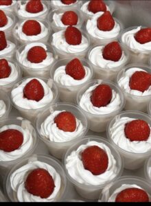 ゼリー液を作りカップに流し、固まったらホイップを絞る。そしていちごをのせる。とても手間のかかる作業ですが2学期最後のデザートも手作りがいい!と最後まで悩みこの形に。