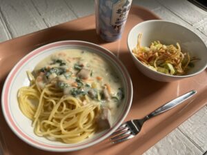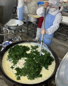 今日は野菜の王様とも呼ばれる「ケール」を使ったパスタにしました。アブラナ科の野菜で、キャベツやブロッコリーの原種です。関野町の庭田さんが育てたものです。「イタリア野菜はあまり知られていないので、食べるとおいしいことを知ってほしい」とおっしゃっていました。