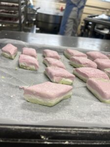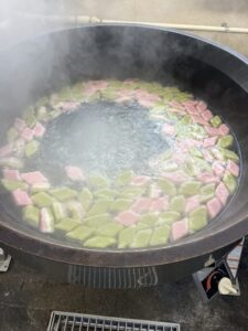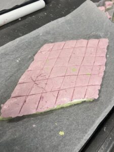 ひしもちは白玉粉をこねて3色にします。それを大きなひし形にのばします。